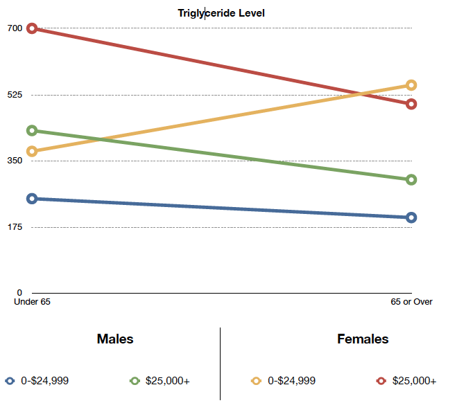 Is the effect of age on cholesterol levels the same for all subgroups defined by sex and income?