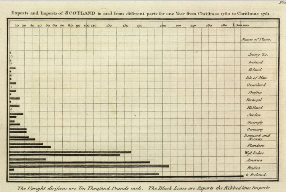 Created first bar chart (featuring Scottish trade data, 1780 - 1781), as well as line and pie charts.