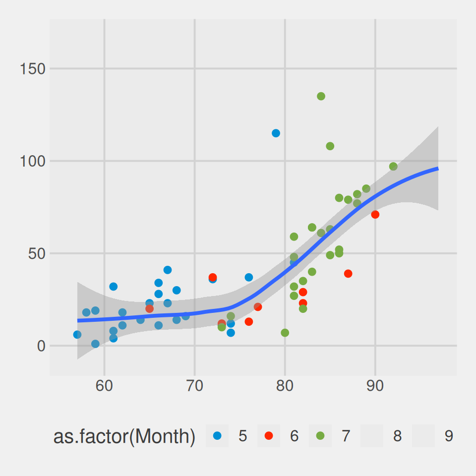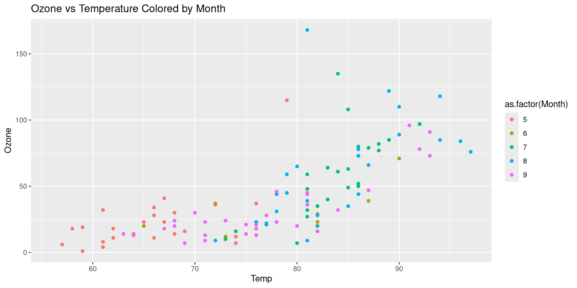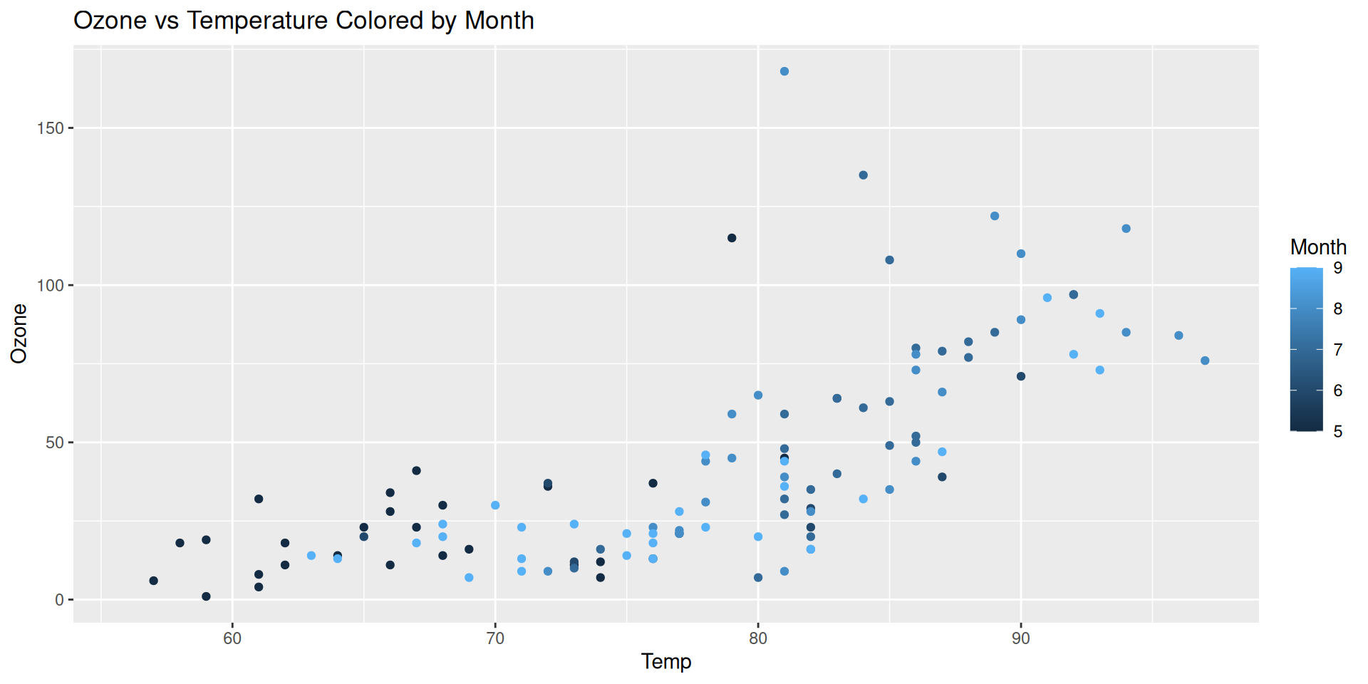 If we like to add more information to the plot, we can use the color aesthetic to map another variable to the color of the points. In this case, we will use Month as the color aesthetic.