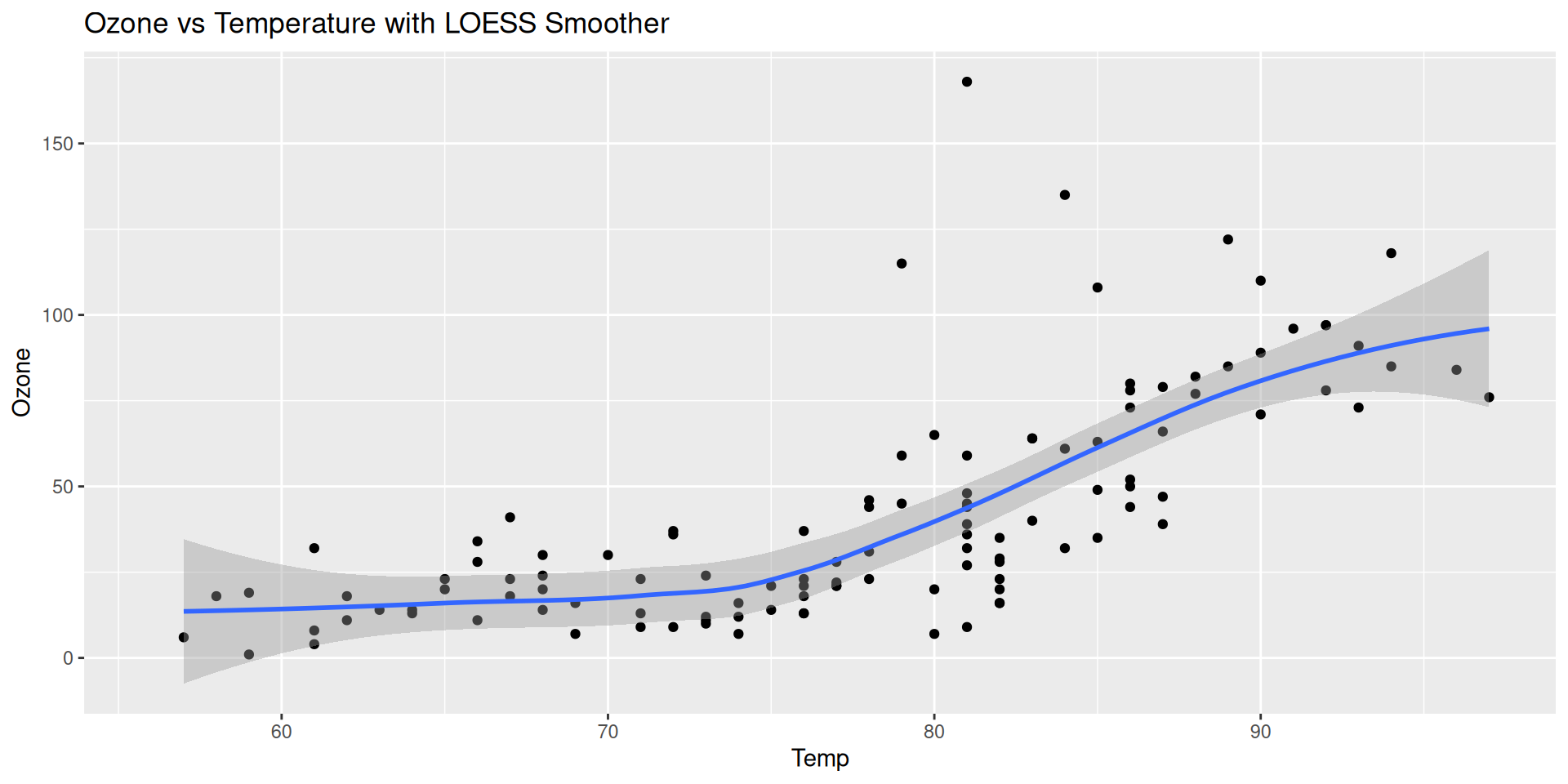 geom_smooth)We can add a smoother line to the plot using geom_smooth(). The default method is linear regression, but we can also use other methods like LOESS (locally weighted scatterplot smoothing).