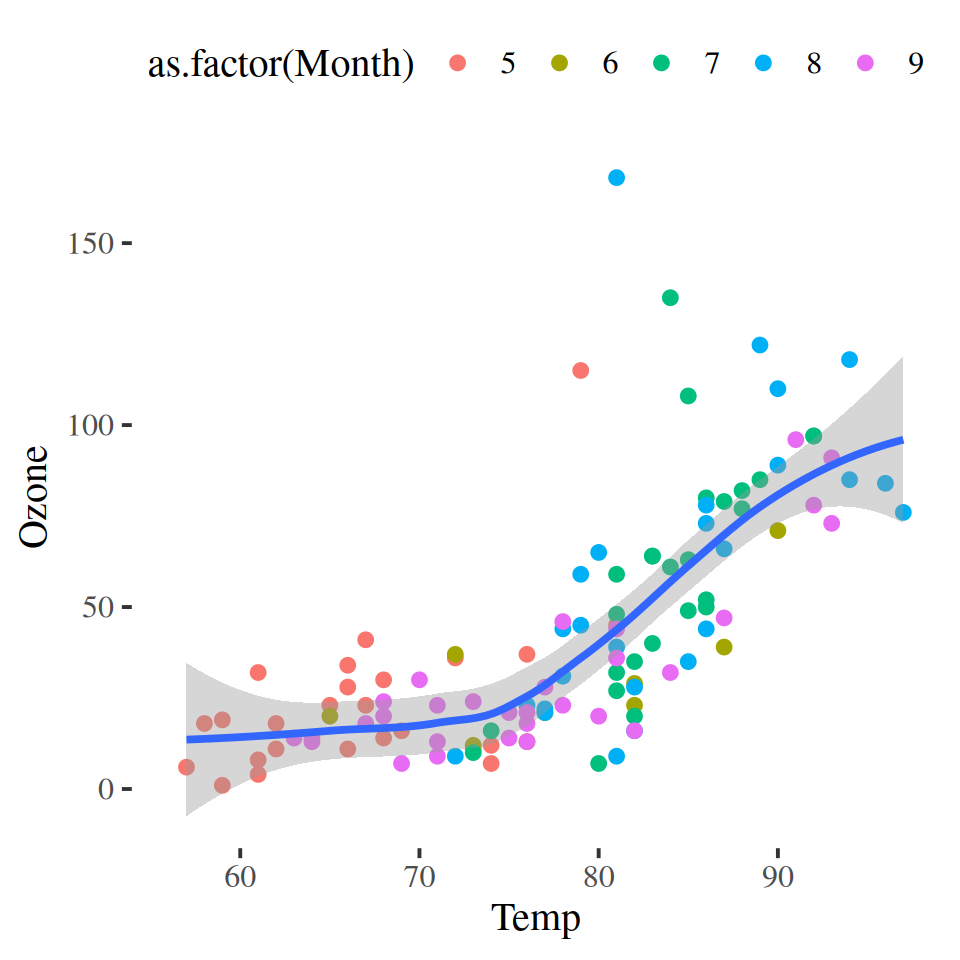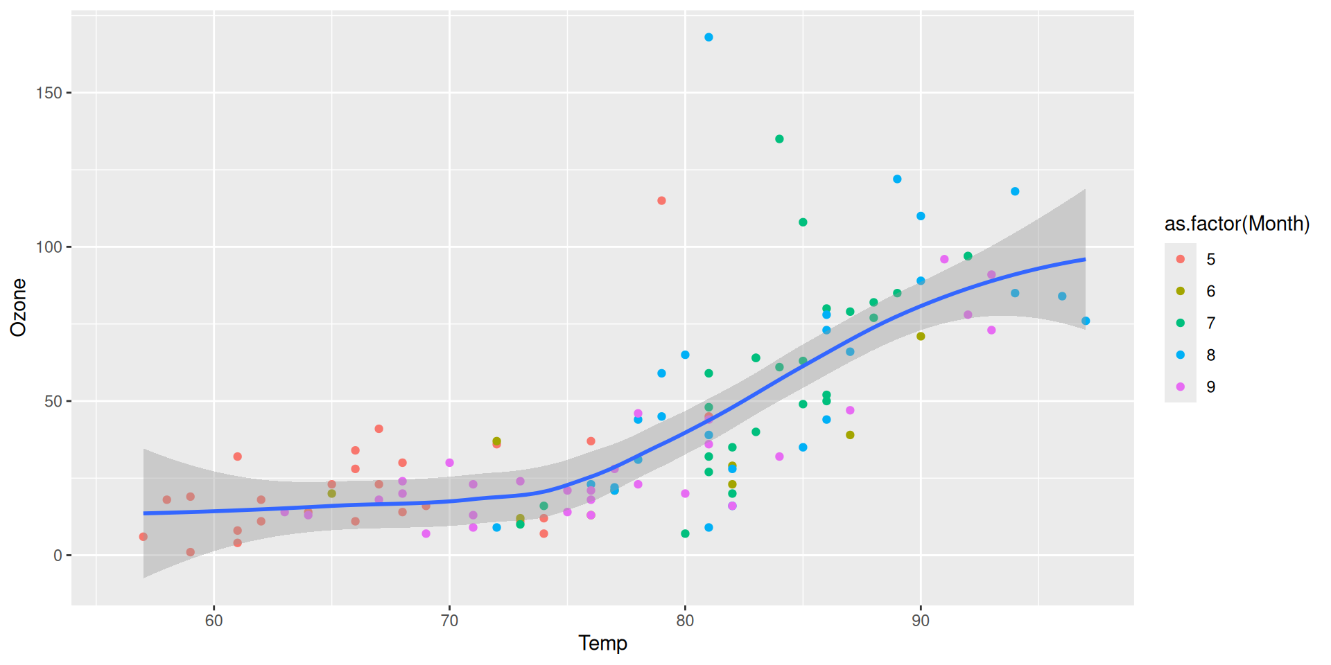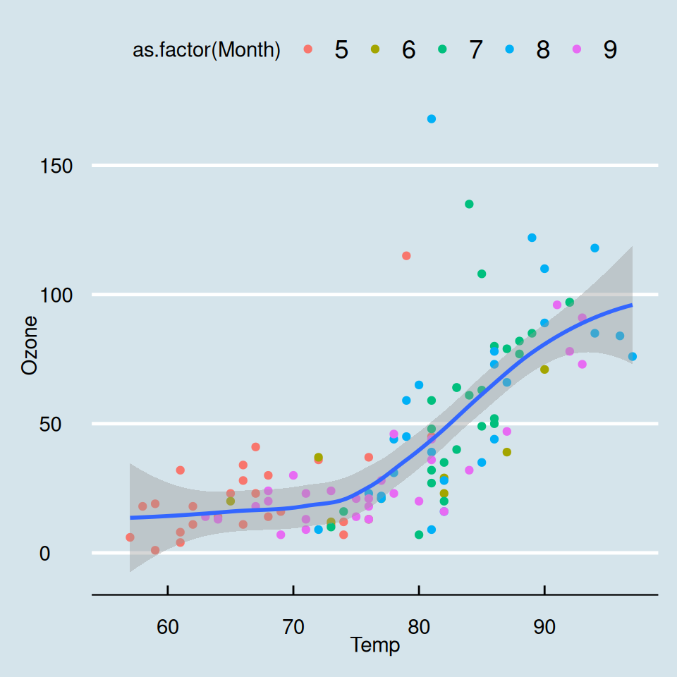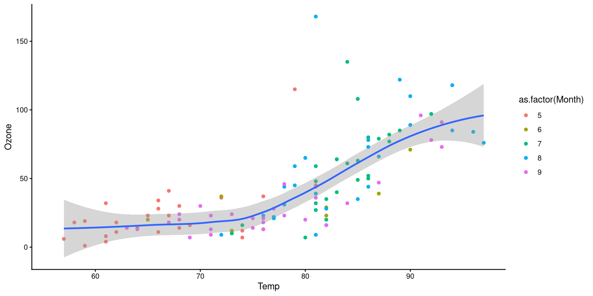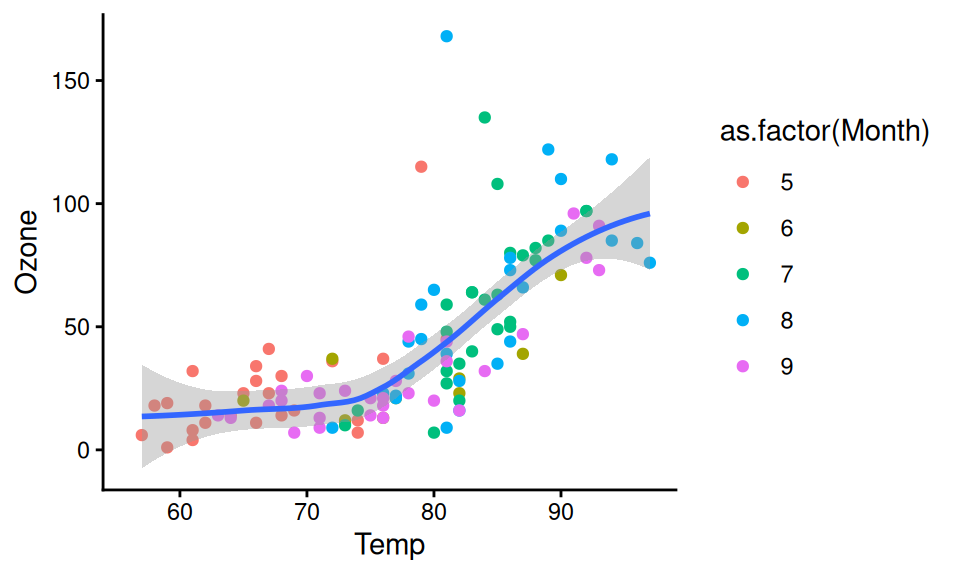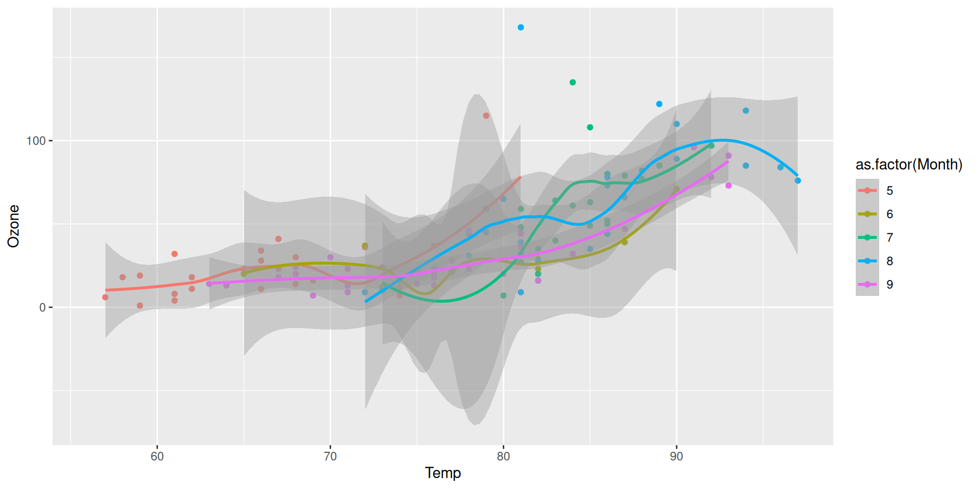 color = as.factor(Month) is passed to both geom_point() and geom_smooth(), so the points and the line are colored by month.