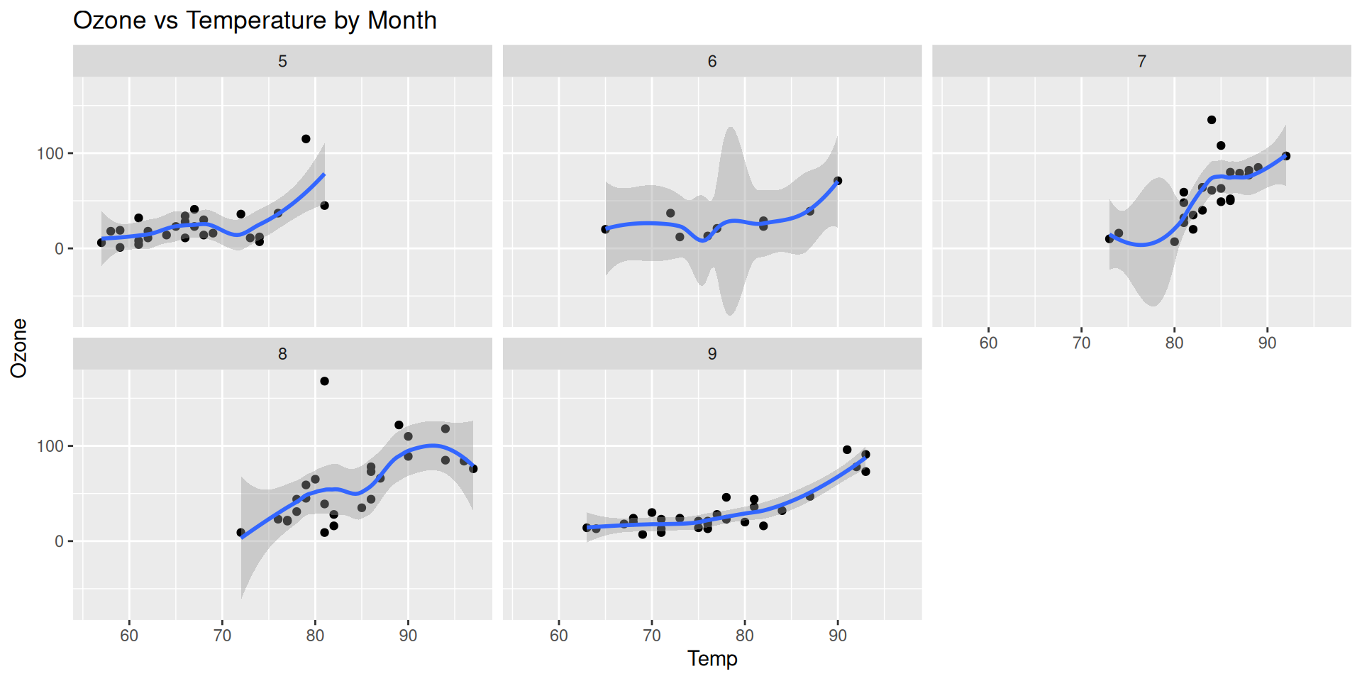 facet_wrap)We can use facet_wrap() to create small multiples of the plot, one for each month. This allows us to see how the relationship between temperature and ozone varies by month.