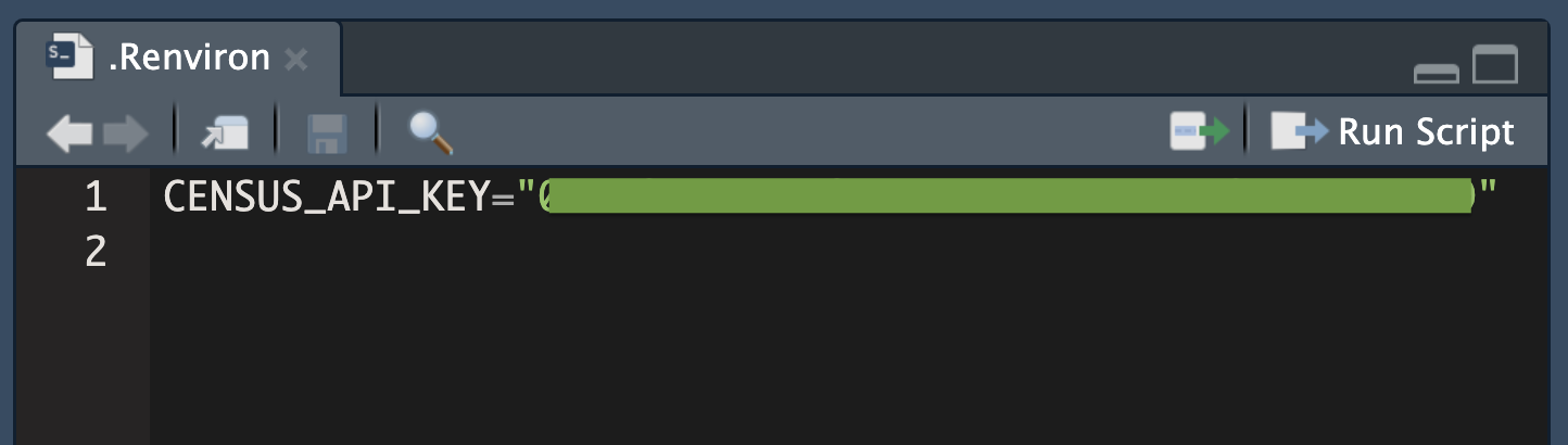 Then in your R scripts, you can access the API key using Sys.getenv("CENSUS_API_KEY"). This way, you can use the API key without hardcoding it into your scripts.
