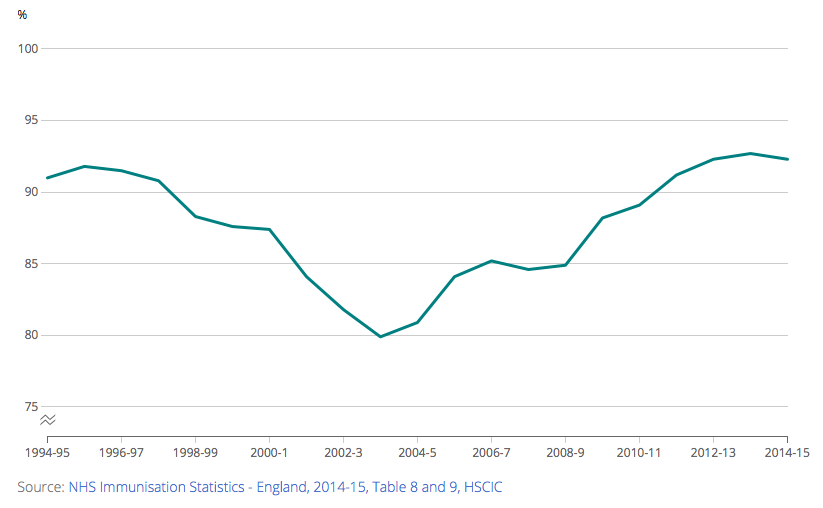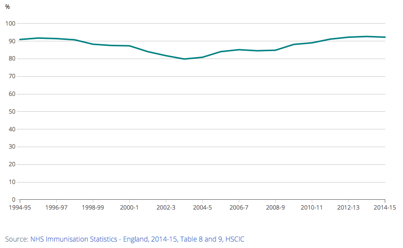 Combined MMR vaccination rate, 1994/95 to 2014/15, England
