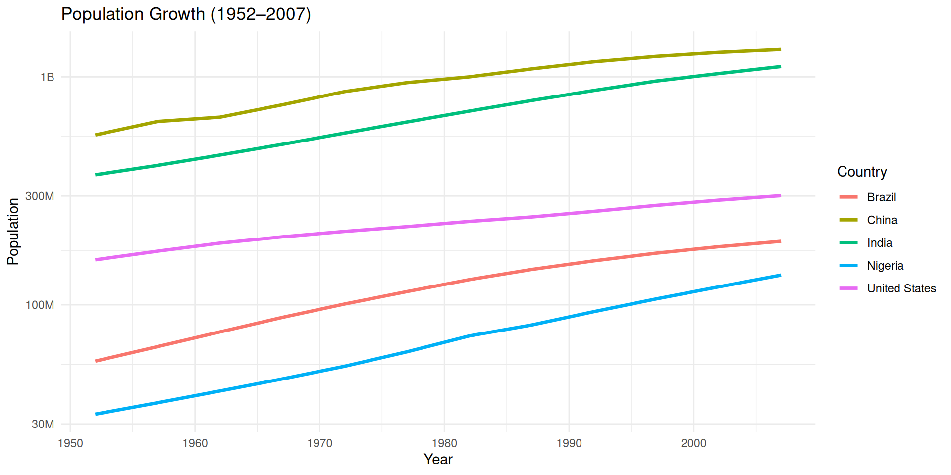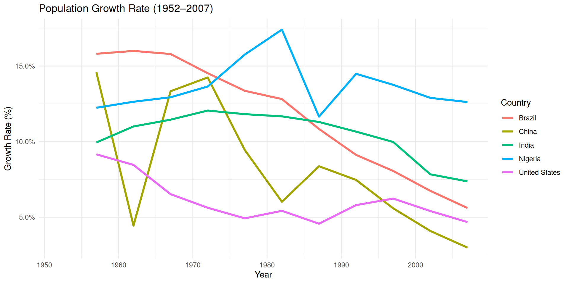 Most countries’ population growth are slowing down, which wasn’t obvious in the previous graph.