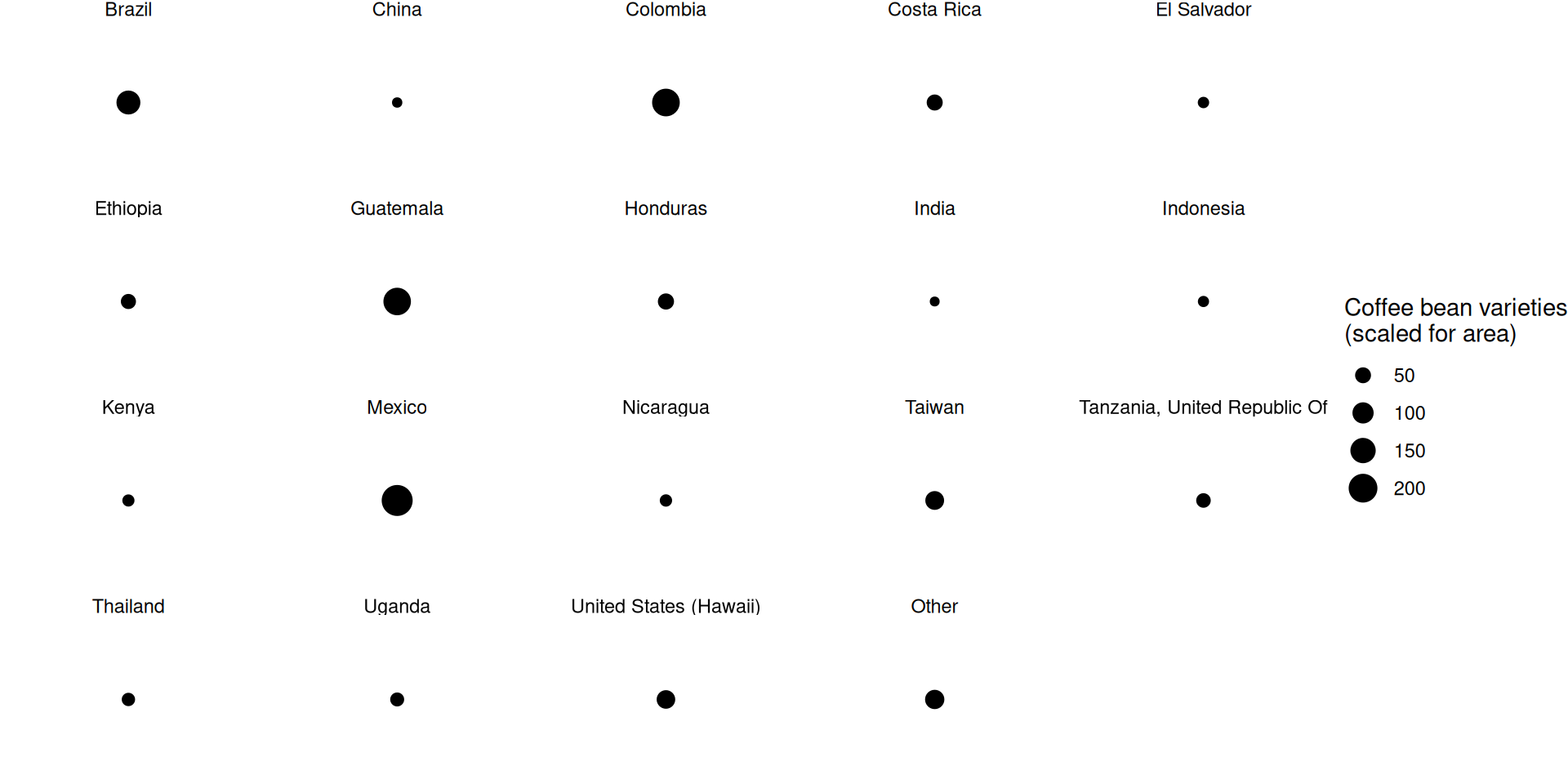 For each country in the 18 most frequent levels, calculate the average total cup points and the number of coffee bean varieties, lump the other countries into the Other category.