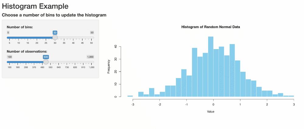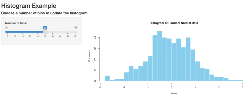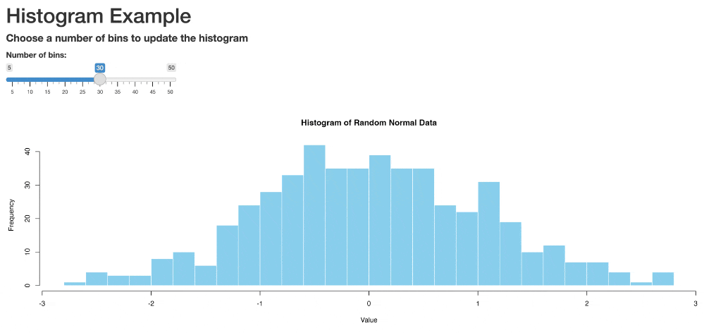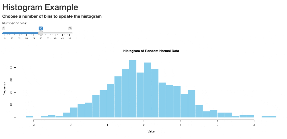 shinyApp(ui = ui, server = server)This takes in user input and uses it to create a histogram with the specified number of bins.