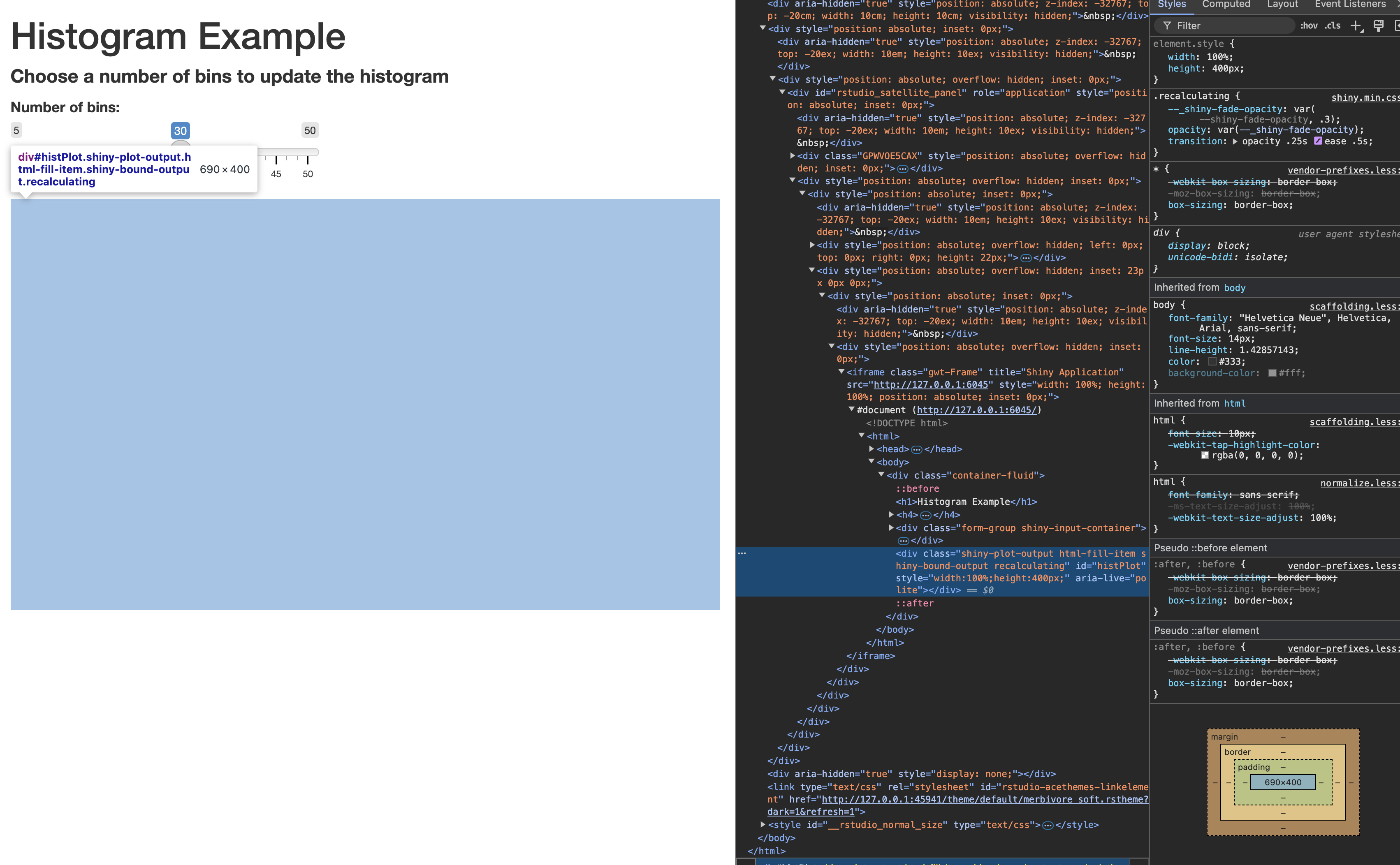 When developing with R shiny, it is recommended that you use Google Chrome browser, and learn how to inspect html pages by right-clicking on the page and selecting “Inspect” or pressing Ctrl + Shift + I (Windows/Linux) or Cmd + Option + I (Mac).