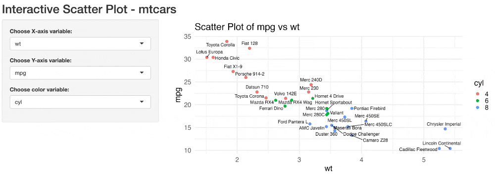 selectInput("colorvar", "Choose color variable:", choices = names(mtcars), selected = "cyl"),