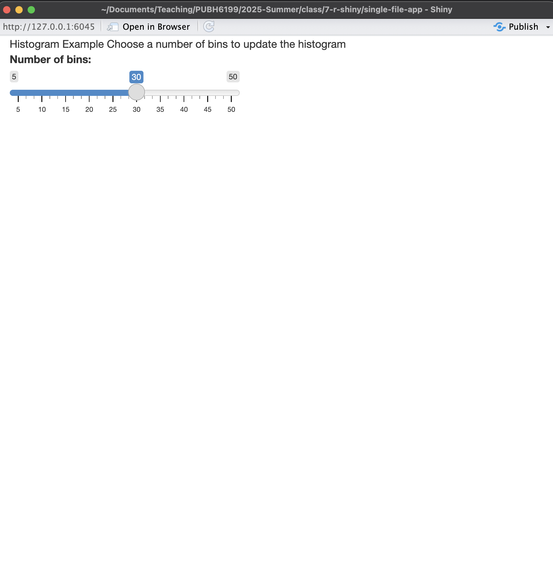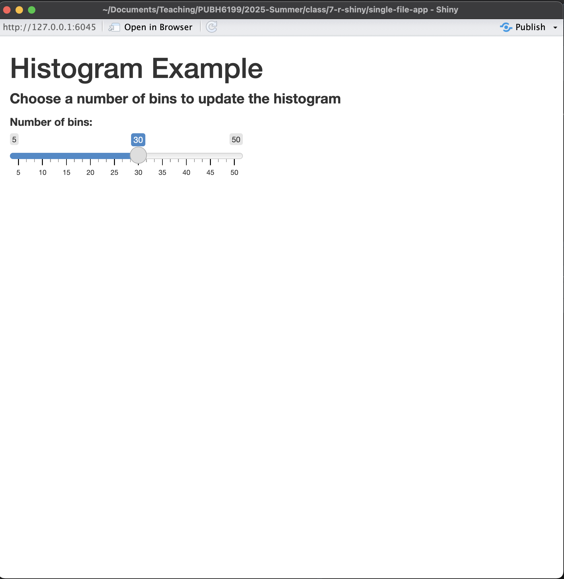 shinyApp(ui = ui, server = server)shiny::runApp("app.R")This will not react to user input because the number of bins is always 30.