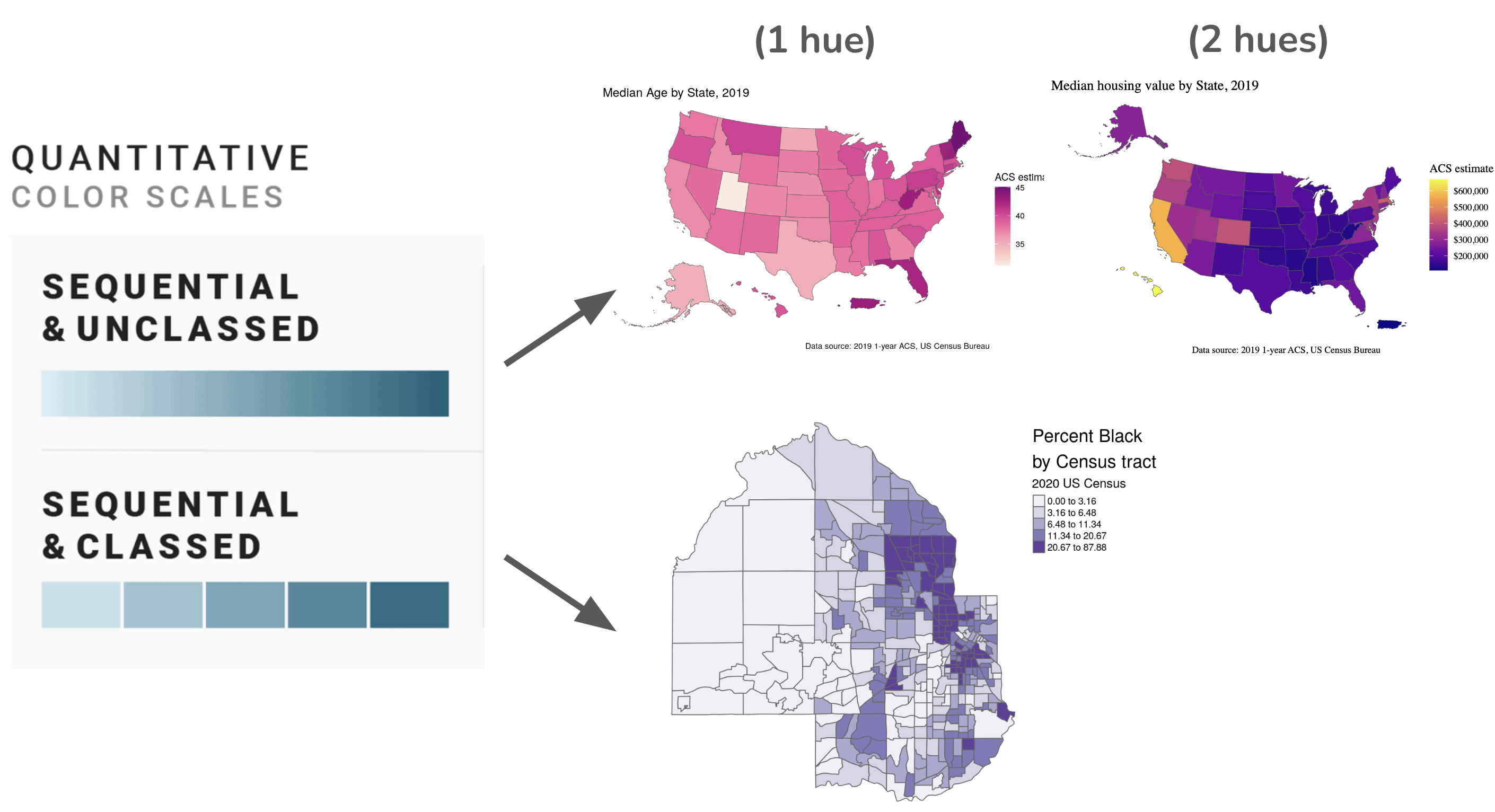 tm_facets(by = "year", ncol = 2)tmapleaflettigris and tidycensusSource: Which color scale to use when visualizing data, by Lisa Charlottte Muth.