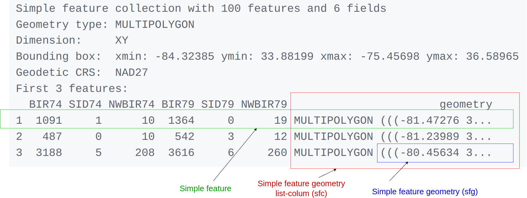 tmapleaflettigris and tidycensussf, sptmap, ggplot2, cartographyleaflet, mapview, ggmaprgdal, rmapshapertigris, tidycensus{sf}: simple featuresThe {sf} package is the standard way to work with vector spatial data in R. It replaces older tools like {sp} with a simple, tidy-friendly interface.