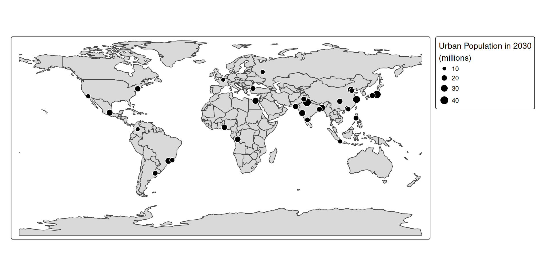 size.legend = tm_legend(title = "Urban Population\n(millions)")) +